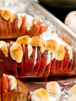 Individual Hasselback sweet potatoes with marshmallows are a fun spin on a classic sweet potato casserole for a Thanksgiving side dish. Each potato is sliced like an accordion and stuffed with marshmallows and baked until tender.