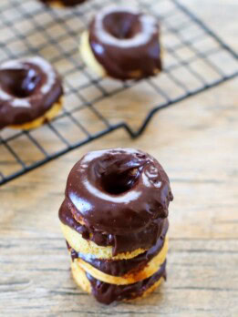 These mini chewy mochi cakes are shaped like donuts and topped with a chocolate glaze.