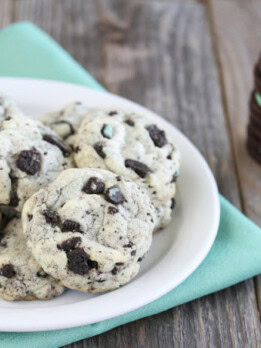 These cookies and cream cookies have a minty twist with crushed mint Oreo cookies mixed into the dough. They bake up soft and chewy with flecks of mint green cream baked inside.
