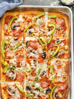 - The original recipe used a 10 x 15 inch pan, which is the size used for sheet cakes, but is smaller than the standard cookie sheet. I don't have that size pan so I used a standard half sheet cookie sheet which is 12 x 18 inches. The recipe still works, the crust just won't reach fill to the edge of the pan. I don't recommend using a 9 x 13 inch baking pan. This is too small and your dough will end up being thick and more soft and not as crispy.