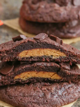 These chocolate peanut butter cookies are stuffed with Reese’s peanut butter cups so each cookie has a creamy peanut butter center. The cookies are topped with chocolate chunks, too. They are so rich and chocolatey –the perfect cookie for anyone who loves peanut butter and chocolate.