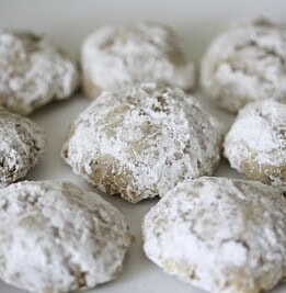 The cookies are thought to have Russian roots, but they are also known as Mexican, Italian, Swedish, and Danish wedding cookies and some people refer to them as snowball cookies. They are usually made with pecans but there are hazelnut, almond and walnut versions, too. Here in the US, they are a popular cookie to make during the Christmas and holiday season.
