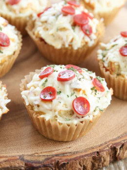 I made these with my favorite pizza toppings: pepperoni and cheese. They’re as easy as making muffins or cupcakes, and they look so cute on a serving platter. They’re the perfect appetizer or snack for parties.