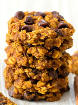 These healthy pumpkin oatmeal cookies are easy to make. They are soft and chewy and taste like pumpkin pie oatmeal in cookie form. They are also flourless, eggless, and butterless, making them great for breakfast or a snack.