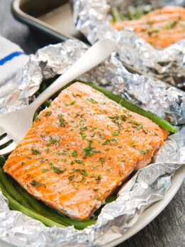 Excellent recipe. I didn’t use veggies, or the dill, and grilled the salmon. One thing, spray the foil with Pam before placing the salmon skin side down, or the skin will stick to the foil. I grilled for 15 minutes. Will definitely make again!