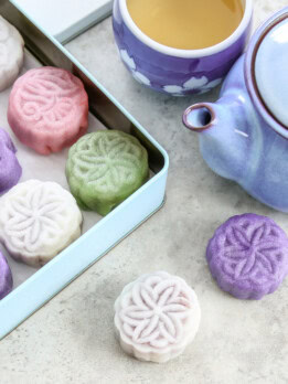 Originally from Hong Kong, snow skin mooncakes are made with roasted glutinous rice flour, giving them a soft outer coating, similar to a super soft mochi. (For a slightly chewier texture, you can steam them before serving.) The delicate white shell gives them a snowy appearance, hence the name. With a little bit of food coloring, you can also make other colors.
