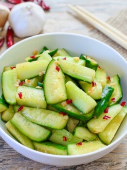 One of my favorite ways to eat cucumbers is Chinese-style cucumber salad. Crisp cucumber pieces are seasoned with just a few simple spices to create a crunchy and flavorful dish.