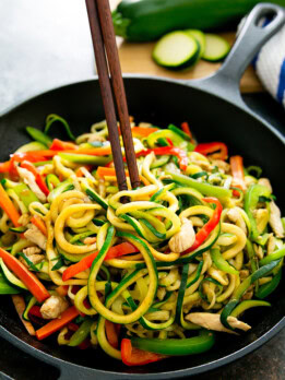 - When chicken is almost cooked, add in carrots and bell peppers. Cook until vegetables are tender and chicken is completely cooked. Add in zucchini noodles and pour sauce over noodles. Stir and toss until everything is evenly coated and cook until zucchini noodles are tender but still crisp (about 2-3 minutes). Dish out and serve immediately.