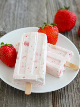 This newest version really does taste like cheesecake in ice pop form. They’re creamy and I love the little pops of red from the strawberries. They’re also easy to make with just four ingredients and you can use your blender to make them.