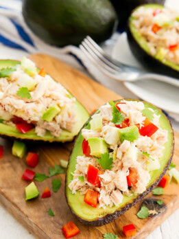 Avocado tuna salad is stuffed inside avocados for a fun, healthy and easy meal.