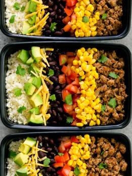 - When rice and turkey have cooled, you can package into your meal prep containers*. First, divide the cauliflower rice evenly across four containers. Add ground turkey to one side of each of the containers. Then add rows of corn, black beans and tomatoes. You can also add avocado now or you can wait until day of eating if you don't want your avocado to brown. Sprinkle cheese across or add as another row. Garnish with cilantro. You can also add lime wedges to squeeze on right before eating.
