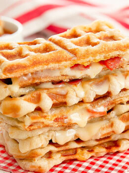 - Once finished making the pizza crust waffles, place one waffle back into your waffle iron. Add a slice of cheese and place about 18 mini pepperoni on the cheese surface. Add another pizza waffle on top and then close your waffle iron. It's okay that it doesn't close all the way. Cook until cheese is melted. Repeat with remaining pizza waffles. Serve while warm with marinara sauce for dipping.